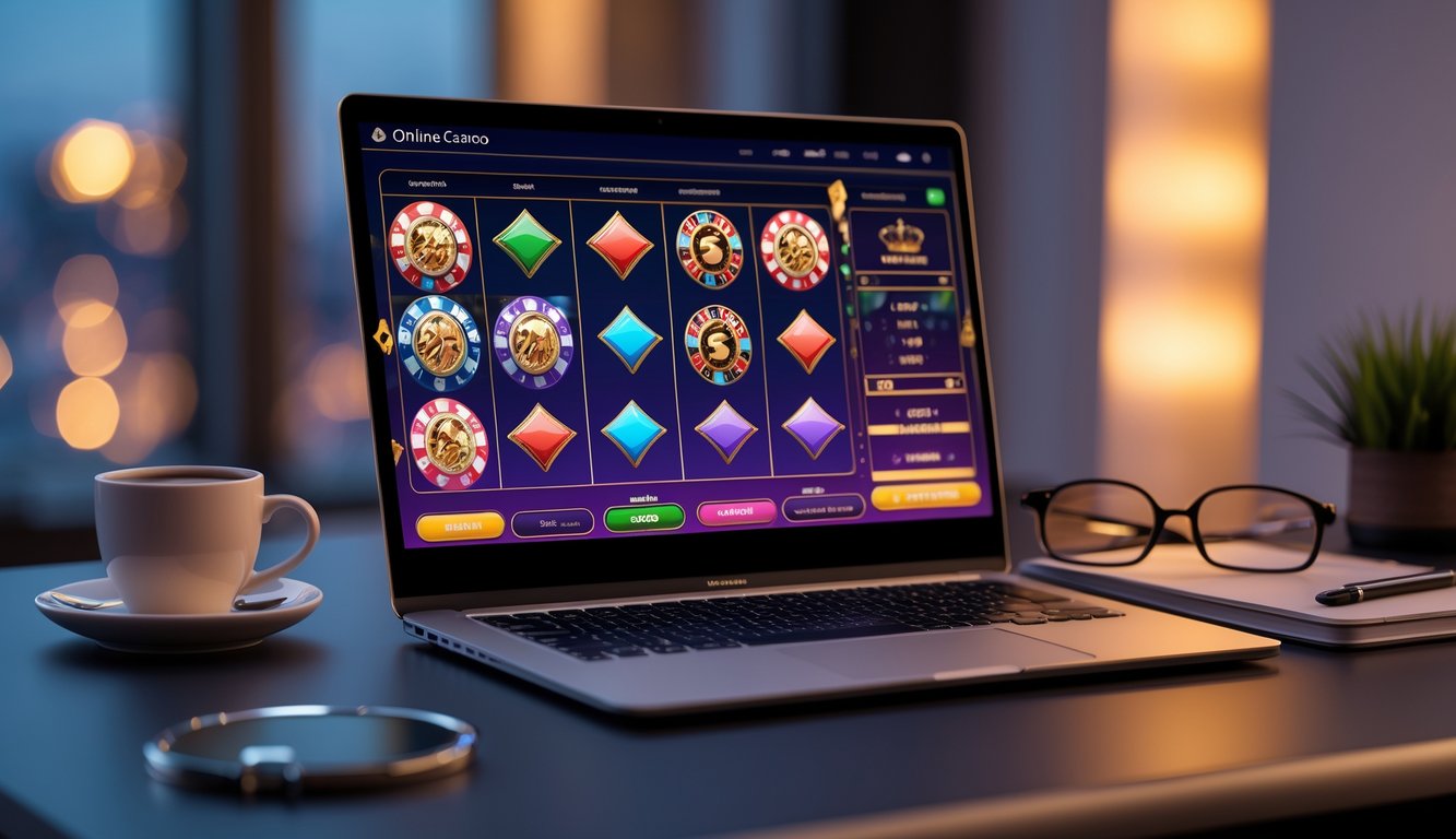 Seorang pengguna duduk di depan laptop dengan tampilan permainan kasino online yang berwarna-warni di layar, suasana hangat dan profesional di ruang kerja.